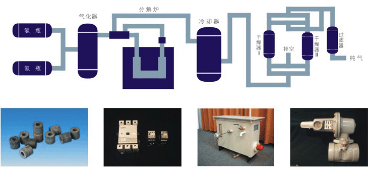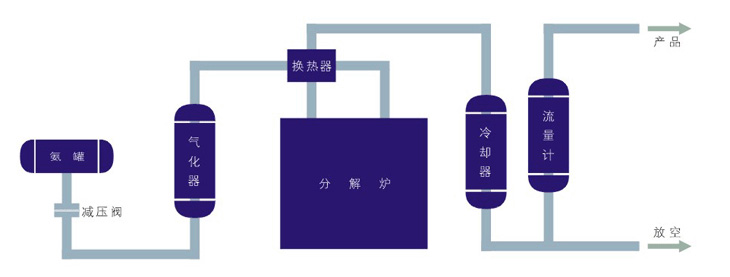 本装置首先将液氨汽化为氨气,然后使其进入氨分解炉,氨气被加热至800℃左右,在镍催化剂的作用下,氨气发生裂解反应,2NH3= 3H2+N2 。经裂解后产生的氢氮混合气再经冷却后,进入装有分子筛的干燥器进行残氨、微量水的深度吸附干燥,从而获取纯净的氢氮混合气。